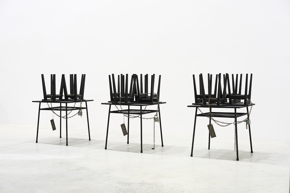 Hanna Łuczak, Przerwa, 1993, instalacja wieloelementowa: 3 stoły, 12 taboretów, 3 łańcuchy, 3 tabliczki metalowe
