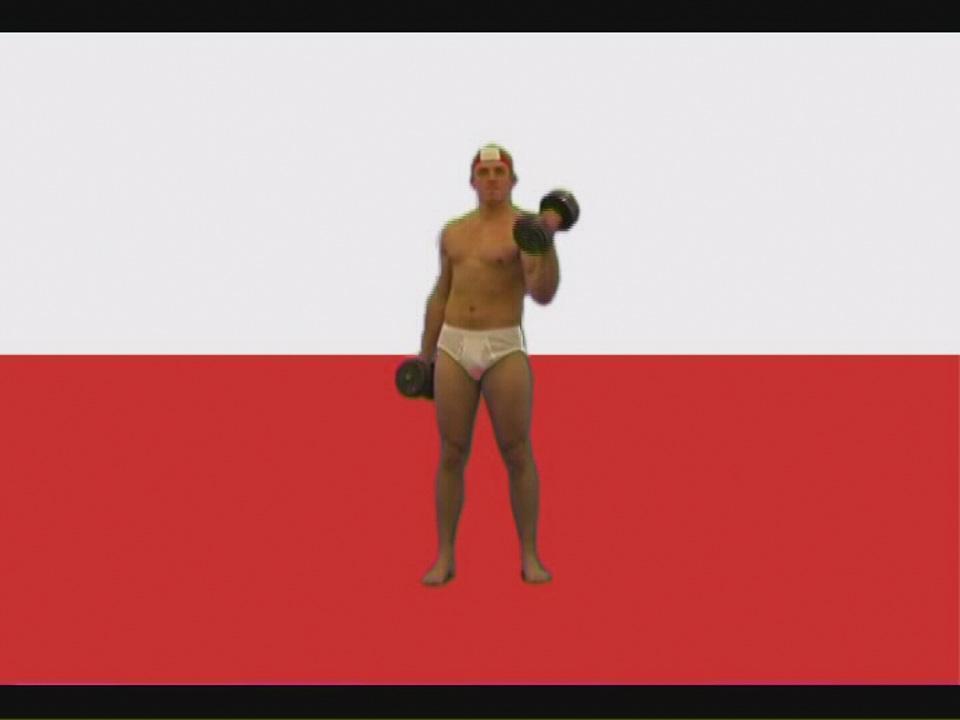 Wideo Jakuba Bąkowskiego Flaga wpisuje się w szeroko zakrojone refleksje na temat mitów i wyobrażeń funkcjonujących w świadomości zbiorowej, jak też stereotypów i wartości kształtujących mentalność społeczeństwa. Bąkowski, posługując się czytelnym symbolem, jakim jest flaga państwowa, poddaje analizie patriotyzm – postawę ważną dla zbiorowego wizerunku Polaków. Symbol narodowy wykorzystany został jako tło, na którym kulturysta, ubrany w slipy i czepek, rytmicznie podnosi ciężarki. Zestawienie flagi z postacią atlety wprowadza do pracy pierwiastek ironii, a kontrast między powagą symbolu a banalnością gimnastyki rozsadza narosły wokół flagi patos.