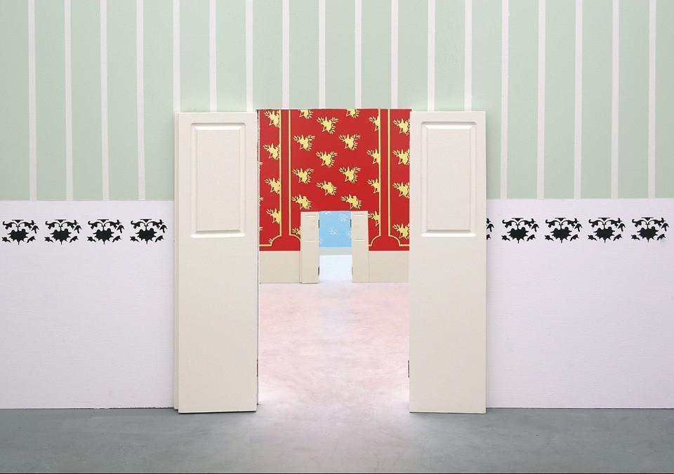 Little Alice is a reference to Lewis Carroll’s Alice in Wonderland (1865). The artist has built four rooms en suite, which follow the order of the literary fiction. Each successive room is smaller so that the viewer can feel like Alice as her size changes with each new experience in Wonderland. The walls of the rooms are covered with different patterns that loosely refer to Victorian England. The skilful use of colour evokes a dreamlike atmosphere, while the contrasting hues cause the illusion of afterimages. When walking from one room to the next, one feels as if they are falling into subsequent scenes of a dream.