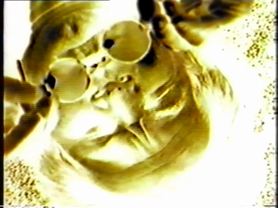 Autobiographical and private motifs allow Robakowski to look at the world with irony on the one hand, and on the other, they serve him to construct his own mythology. In The Glasses (1992), Robakowski’s face fills the narrow frame as he weaves an exceedingly personal narrative about his spiritual condition. A pretext for talking about emotions is provided by the spectacles of his late grandfather Stanisław. It is around them, and the dilemma of whether or not to put them on, that he builds a monologue about depression, anxiety, mental collapse and its impact on the perception of reality. His face, recorded in the negative and turned almost 180 degrees to the side, looks unreal. He seems to be behind glass, “on the other side” as it were. The concentration of image and word, however, brings his story close to the viewer, enfolds the viewer in its intensity.
