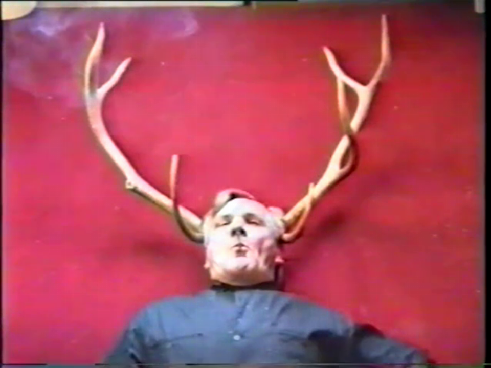 The video Mr Joseph’s Last Will (1990) was used in one of the three epitaphs that Robakowski created between 1966 and 1994, in an installation entitled Mr Deer (Self-Epitaph). The static shot from a bird’s-eye perspective shows the artist lying on a red and pink carpet with deer antlers attached to his head. Holding a burning cigarette in his mouth and exhaling smoke, the performer delivers a longer, unintelligible monologue; the words are gibberish, as if he were speaking with his mouth full. Robakowski commented on his self-epitaph: “Today, after almost thirty years, another epitaph appears, this time of ‘Mr Deer’, to personify the desire for arrogant gestures. It is meant to decry the miserable fate of the contemporary artist as a naïve fool, a bootlicker and creator of beautiful ideas and things…”. Robakowski’s ironic commentary refers to himself; by drawing on the stereotypical associations associated with deer (in Polish: jeleń, which means ‘loser’), he creates an image of a naïve man, feeding on ideas, but at the same time endowed with a creative drive, a force that compels him to make “arrogant gestures”.